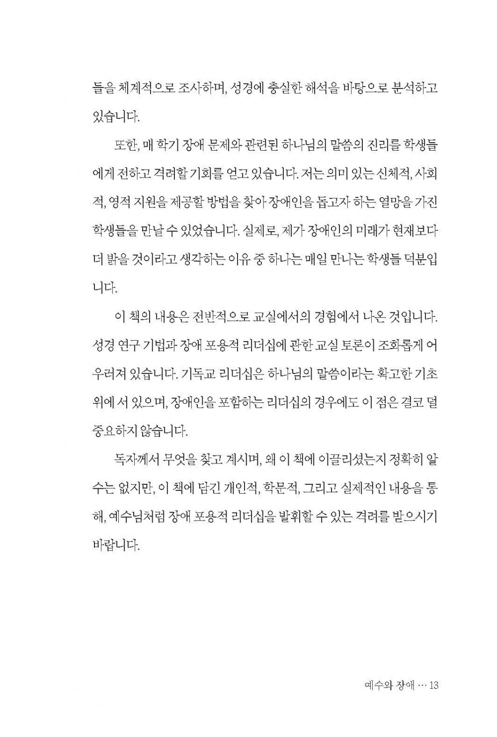 교회 장애사역 지침서로서, 단순히 성경적 원리만을 다루는 것이 아니라, 교회가 장애인을 어떻게 품고 사역해야 할지에 대한 실제적인 가이드 라인을 제시한다. 먼저는 복음서에서 예수님이 장애인들과 상호 관계한 내용을 어휘, 구문, 구조, 수사, 신학적 관점에서 조사한 내용을 다루고 있다. 이를 통해 장애인들과 상호 관계한 예수님의 리더십 스타일을 성경이 어떻게 제시하는지를 밝히고, 이러한 성경적 조사 결과를 가지고 교회지도자들이 사역과 교회 “몸 생활”에 어떻게 적용할 수 있는지를 보여준다. 그리스도인들이 믿는 것과 그 믿는 바를 어떻게 실천하는지를 안내한다.