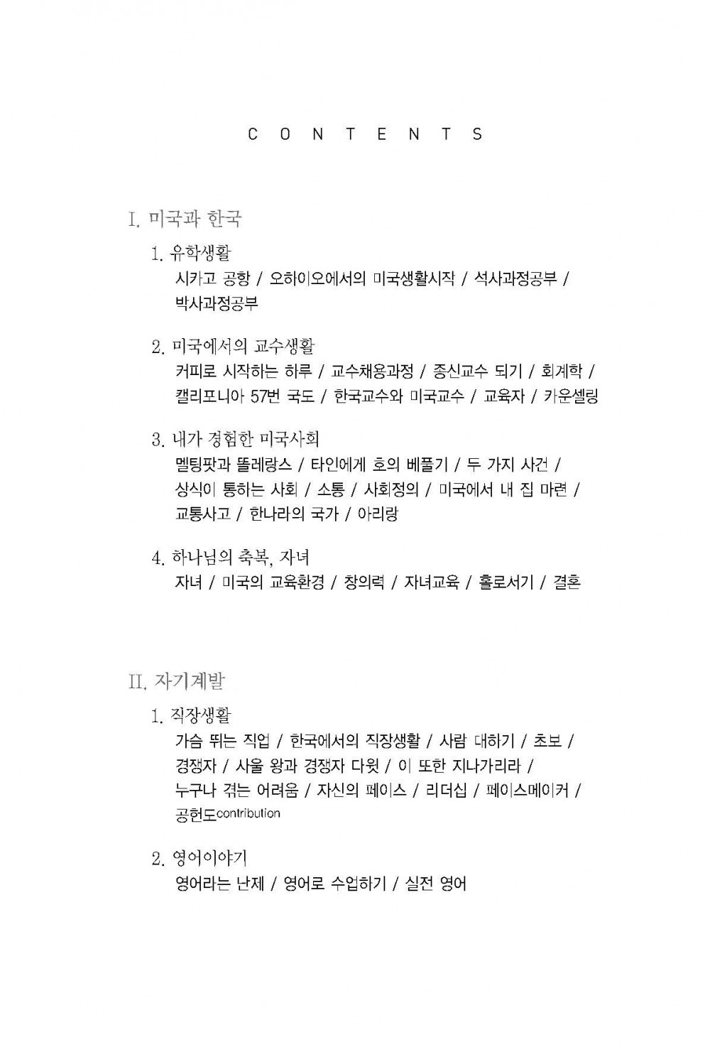 나는 캘리포니아 57번 국도가 내려다보이는 사무실에서 온종일을 보낸다. 이 사무실은 내가 근무하는 캘리포니아 주립대의 경영대학 4층에 있다. 이글들 대부분이 쓰인 곳이기도 하다. 유학을 준비하는 사람들, 교수를 꿈꾸는 사람들, 신앙 가치관을 정립해 나가고 싶은 사람들, 그리고 같은 시대를 사는 사람들과 이 책을 통해 교감하는 기회가 되기를 바라본다. 특히 젊은이들이 이글을 통해 새로운 도전의 기회를 발견하고 그것을 향해 나갈 용기를 얻는다면 더할 나위 없이 기쁘겠다.