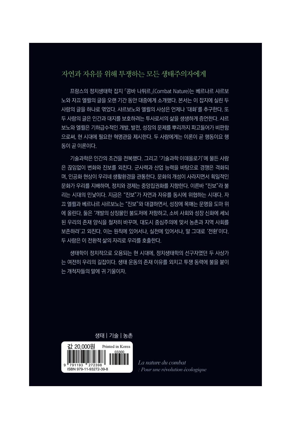프랑스의 정치생태학 잡지 「콩바 나튀르」(Combat Nature)는 베르나르 샤르보노와 자끄 엘륄의 글을 오랜 기간 대중에게 소개했다. 본서는 이 잡지에 실린 두 사람의 글을 하나로 엮었다. 샤르보노와 엘륄의 사상은 언제나 ‘대화’를 추구한다. 또 두 사람의 글은 인간과 대지를 보호하려는 투사로서의 삶을 생생하게 증언한다. 샤르보노와 엘륄은 기하급수적인 개발, 발전, 성장의 문제를 뿌리까지 파고들어가 비판함으로써, 현시대에 필요한 혁명관을 제시한다. 두 사람에게는 이론이 곧 행동이요 행동이 곧 이론이다.