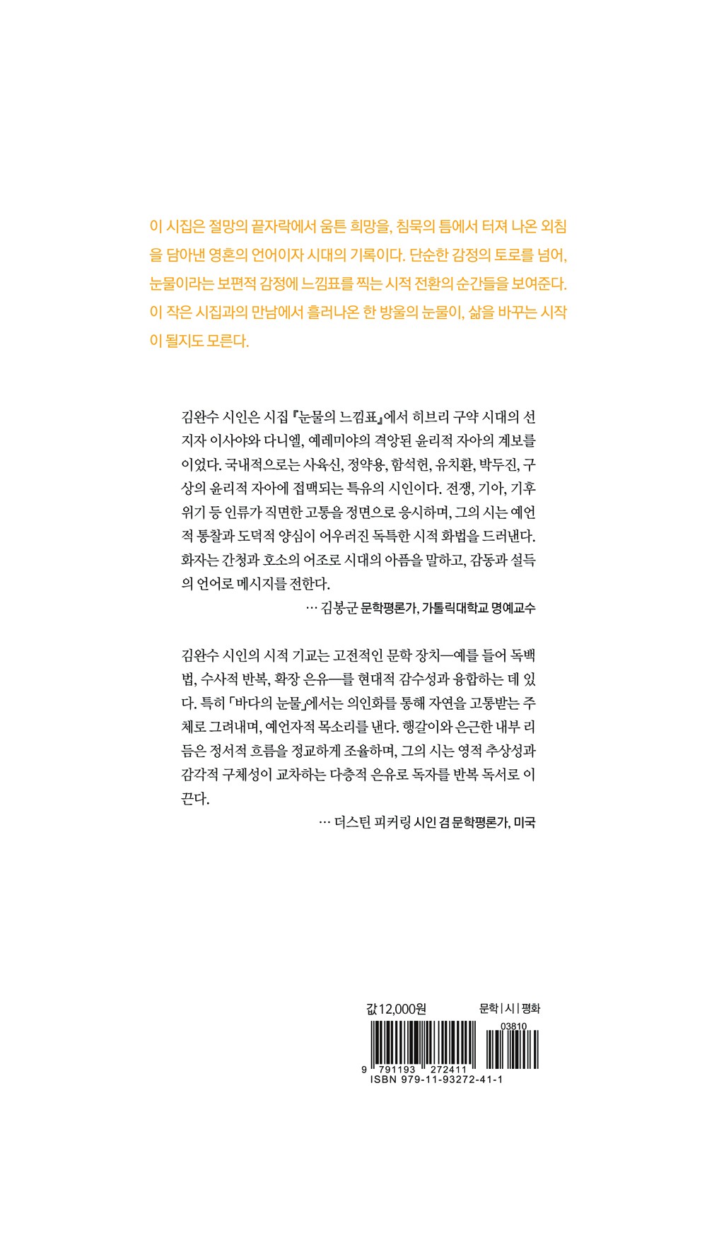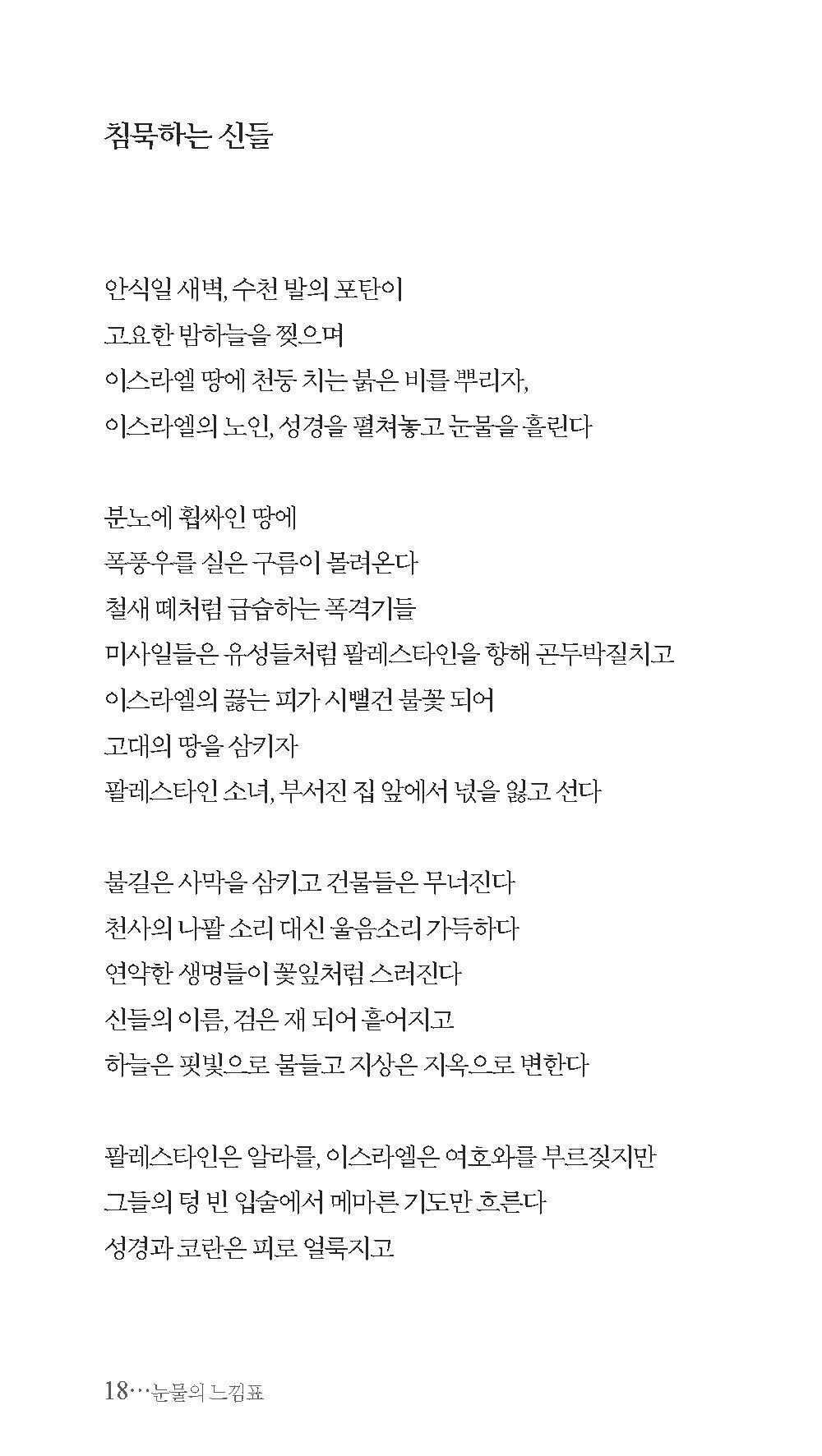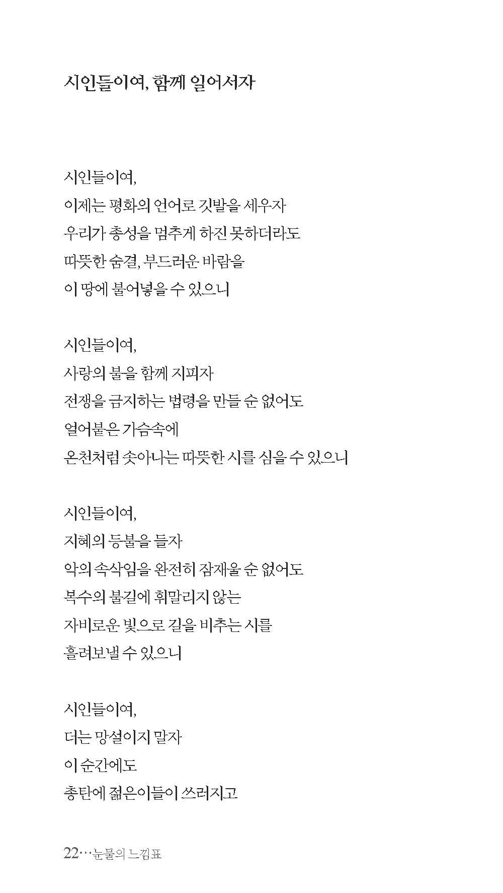 이 시집은 절망의 끝자락에서 움튼 희망을, 침묵의 틈에서 터져 나온 외침을 담아낸 영혼의 언어이자 시대의 기록이다. 단순한 감정의 토로를 넘어, 눈물이라는 보편적 감정에 느낌표를 찍는 시적 전환의 순간들을 보여준다. 이 작은 시집과의 만남에서 흘러나온 한 방울의 눈물이, 삶을 바꾸는 시작이 될지도 모른다.