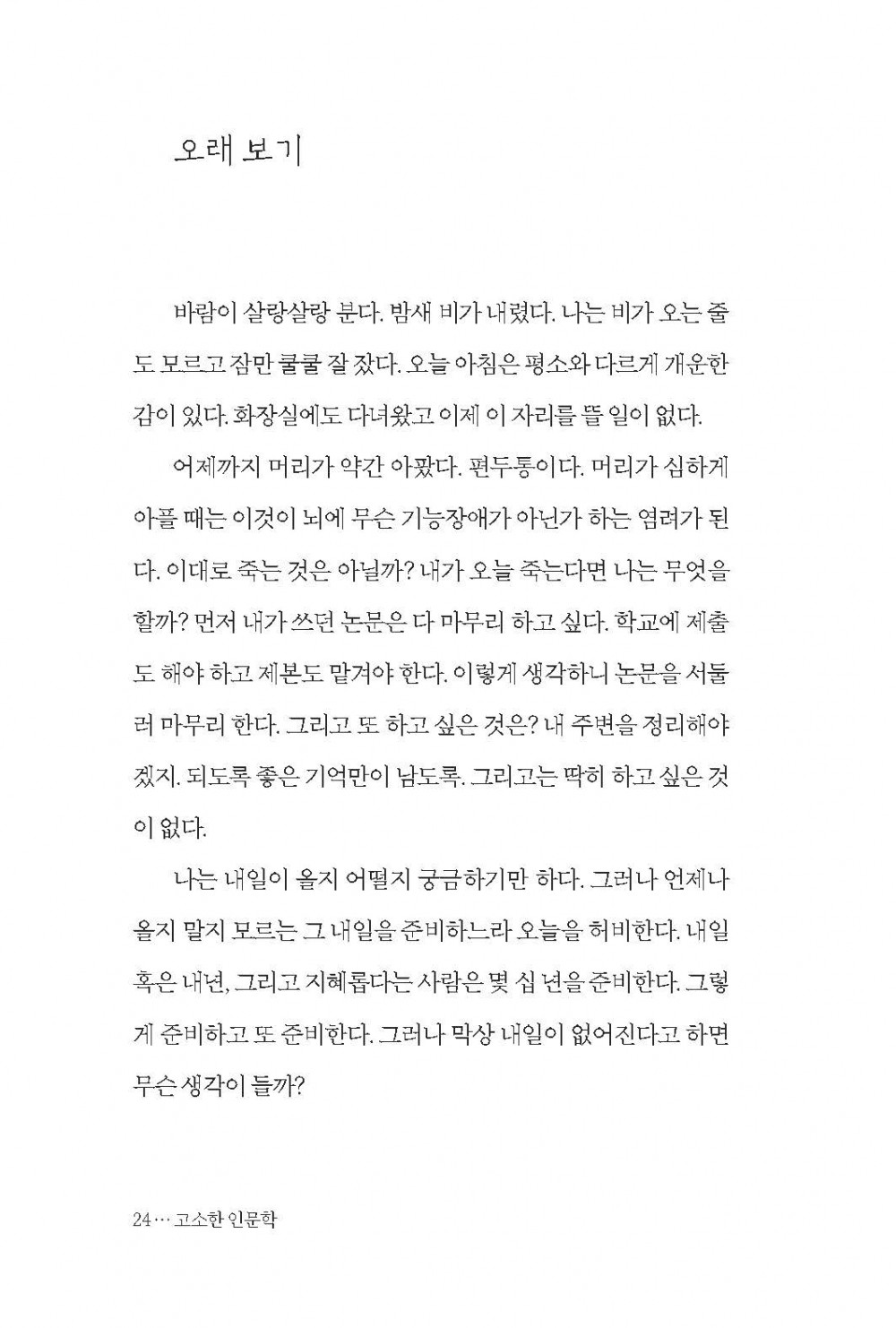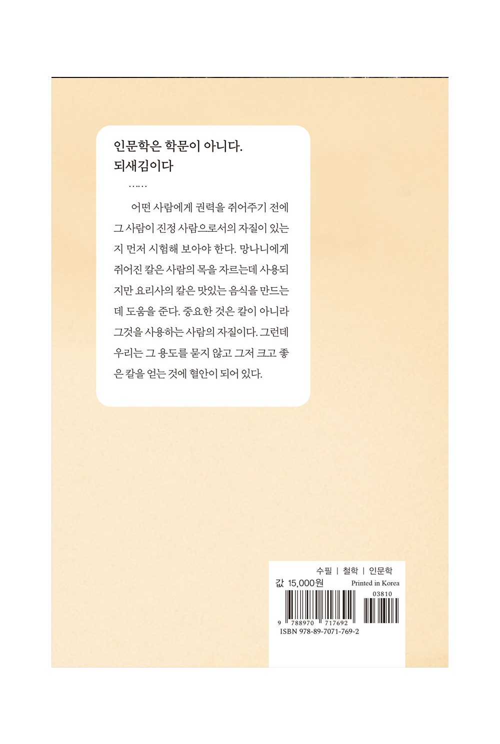 우리는 모두가 인문학자가 되어야 한다. 그것은 학자가 되라는 말은 아니다. 오히려 반추동물이 되라는 말이다. 우리는 동물이다. 하지만 반추할 수 있는 동물이다. 인간만큼 기억력이 좋은 동물은 없을 것이다. 우리는 평생을 기억하며 살아간다. 씹고 또 씹으면 소화되지 않을 것이 없다. 자기 스스로의 삶을 씹어 먹으며, 내가 누구인지 답하며 살아야 한다.
