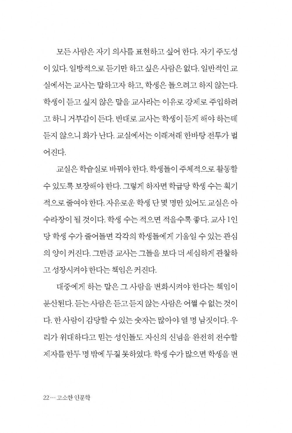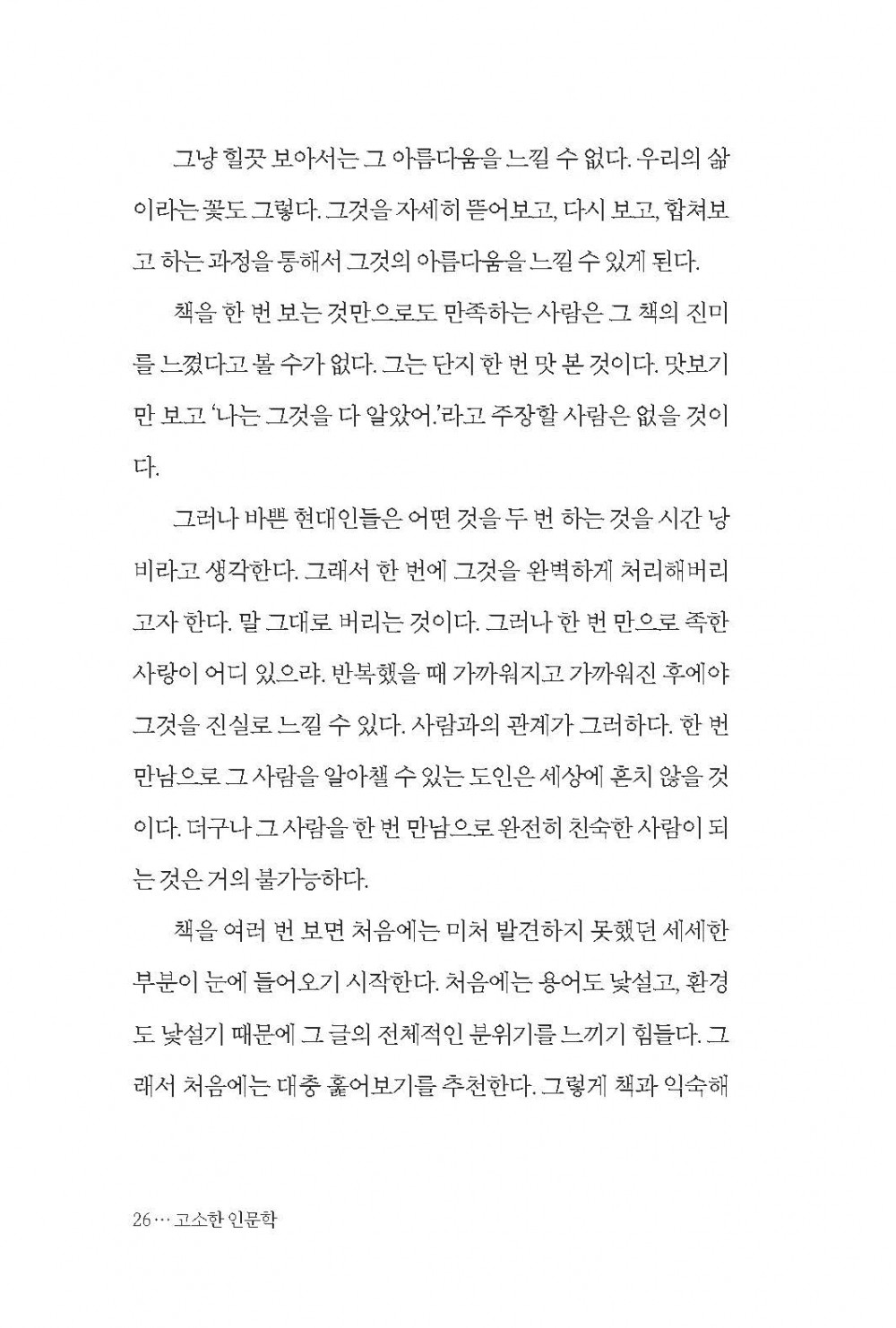 인문학이라고 하면 사람들은 어렵다고 느낀다. 거기에 ‘학’자가 붙었기 때문이다. 뭔가 문학의 냄새가 풀풀 풍긴다. 책을 읽어야만 할 것 같은 기분이 든다. 하지만 이것은 ‘인’+‘문학’이 아니다. ‘인문’+‘학’이다. 즉 인간성을 찾는 것이다. 그것은 누구의 인간성이 아닌 자기 스스로의 인간성이다.