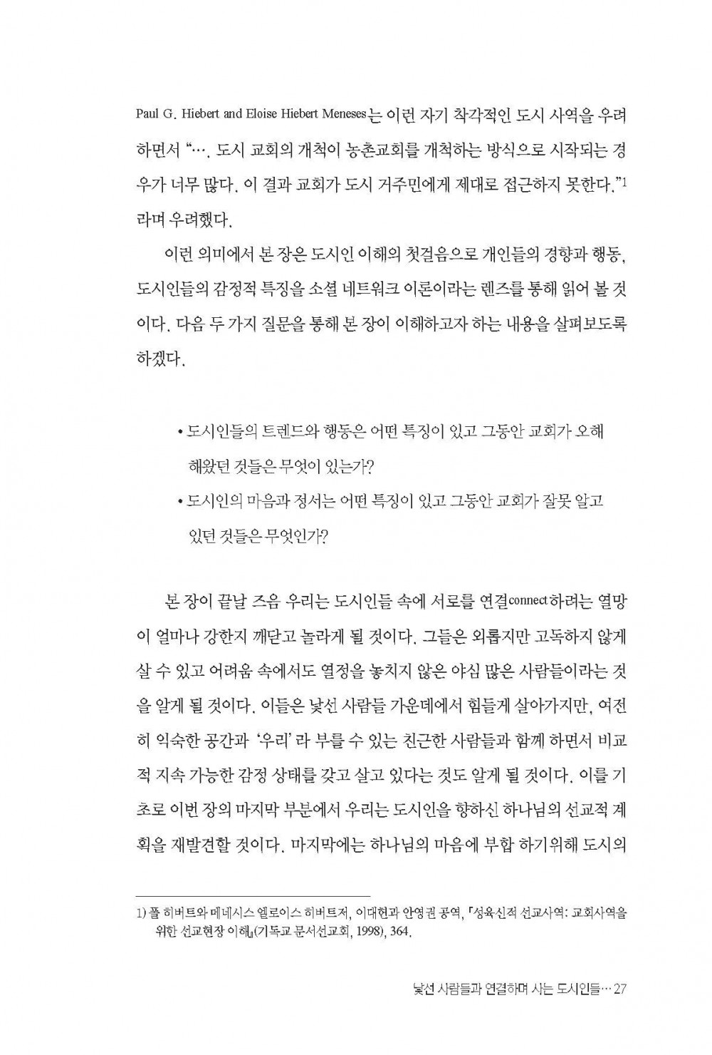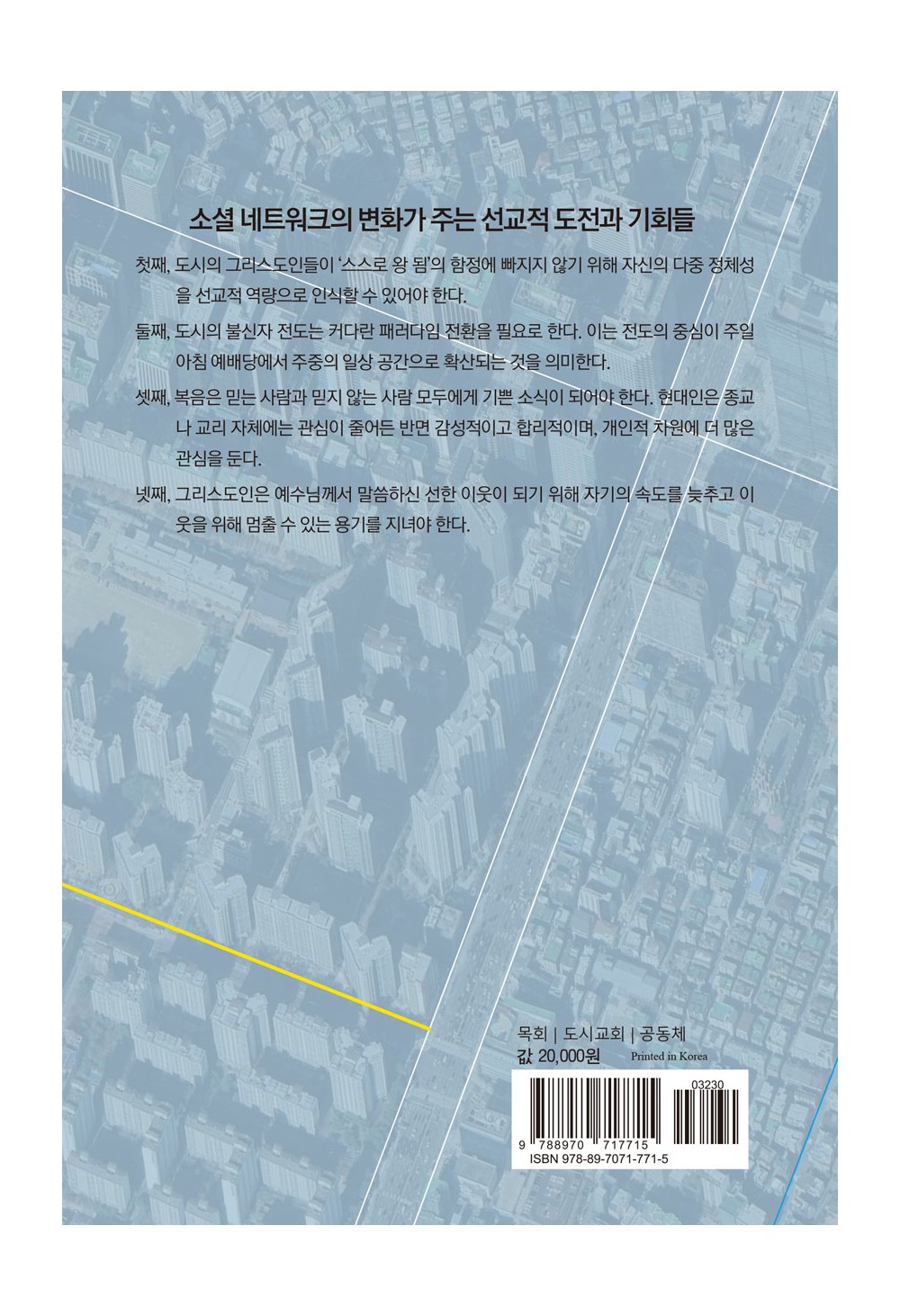 이 책은 기존 교회에 대한 평가도, 도시의 위압적인 힘에 관한 것도 아니다. 그보다 하나님께서 우리에게 주신 새로운 가능성과 징검다리들에 주목한다. 도시인들이 얼마나 희망적이고 인간미를 가진 사람들인지, 이 시대의 도시 사역을 위해 많은 다중 정체성을 가진 이들이 어떻게 활동하고 있는지를 들여다본다. 또한, 불신과 경쟁이 만들어낸 새로운 계층사회와 고도의 전문화가 탄생시킨 도시형 미전도 그룹들에 주목한다. 성공만을 향해 질주하던 중 강도를 만나 고통스러워 하는 이웃에 눈을 뜨면서, 교회는 과거와 비교할 수 없을 정도로 다양해진 기회와 필요 앞에 감격과 새로운 열정을 품게 될 것이다.