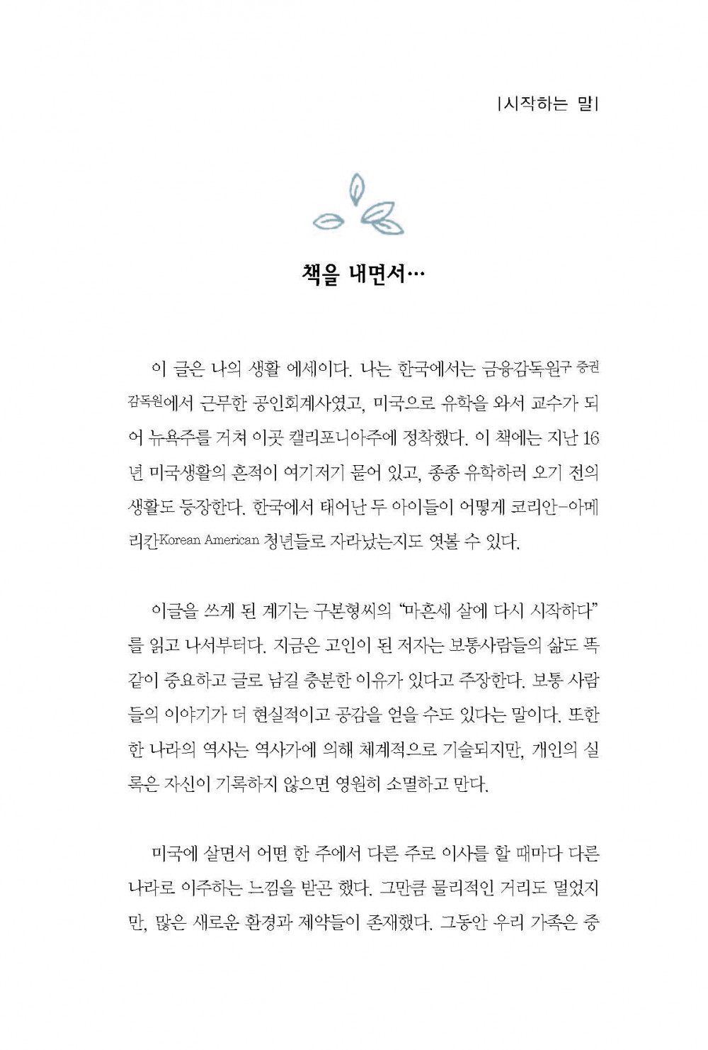 이 글은 나의 생활 에세이다. 나는 한국에서는 금융감독원구 증권감독원에서 근무한 공인회계사였고, 미국으로 유학을 와서 교수가 되어 뉴욕주를 거쳐 이곳 캘리포니아주에 정착했다. 이 책에는 지난 16년 미국생활의 흔적이 여기저기 묻어 있고, 종종 유학하러 오기 전의 생활도 등장한다. 한국에서 태어난 두 아이들이 어떻게 코리안-아메리칸Korean American 청년들로 자라났는지도 엿볼 수 있다.