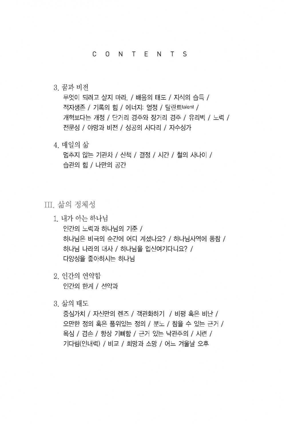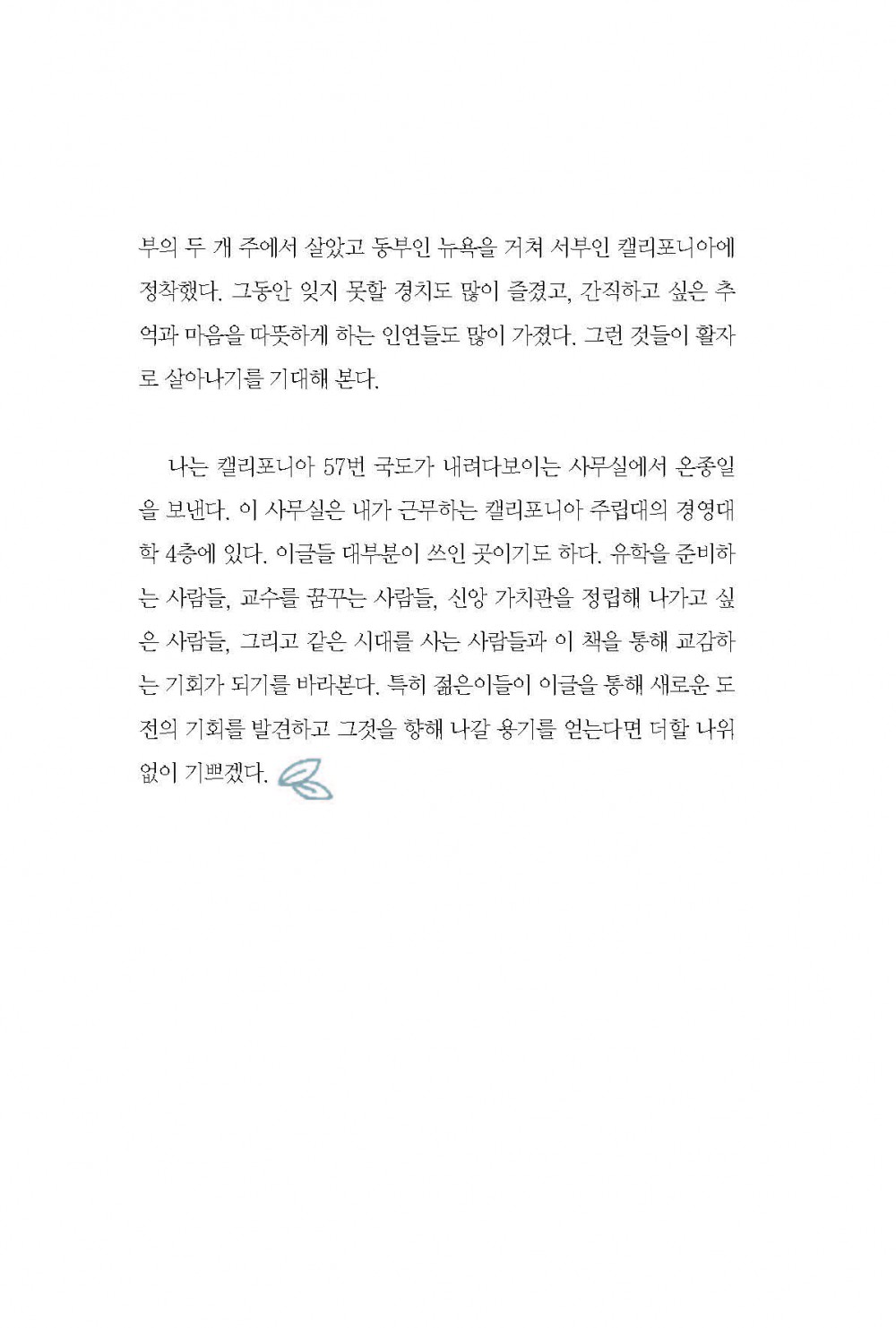 나는 캘리포니아 57번 국도가 내려다보이는 사무실에서 온종일을 보낸다. 이 사무실은 내가 근무하는 캘리포니아 주립대의 경영대학 4층에 있다. 이글들 대부분이 쓰인 곳이기도 하다. 유학을 준비하는 사람들, 교수를 꿈꾸는 사람들, 신앙 가치관을 정립해 나가고 싶은 사람들, 그리고 같은 시대를 사는 사람들과 이 책을 통해 교감하는 기회가 되기를 바라본다. 특히 젊은이들이 이글을 통해 새로운 도전의 기회를 발견하고 그것을 향해 나갈 용기를 얻는다면 더할 나위 없이 기쁘겠다.