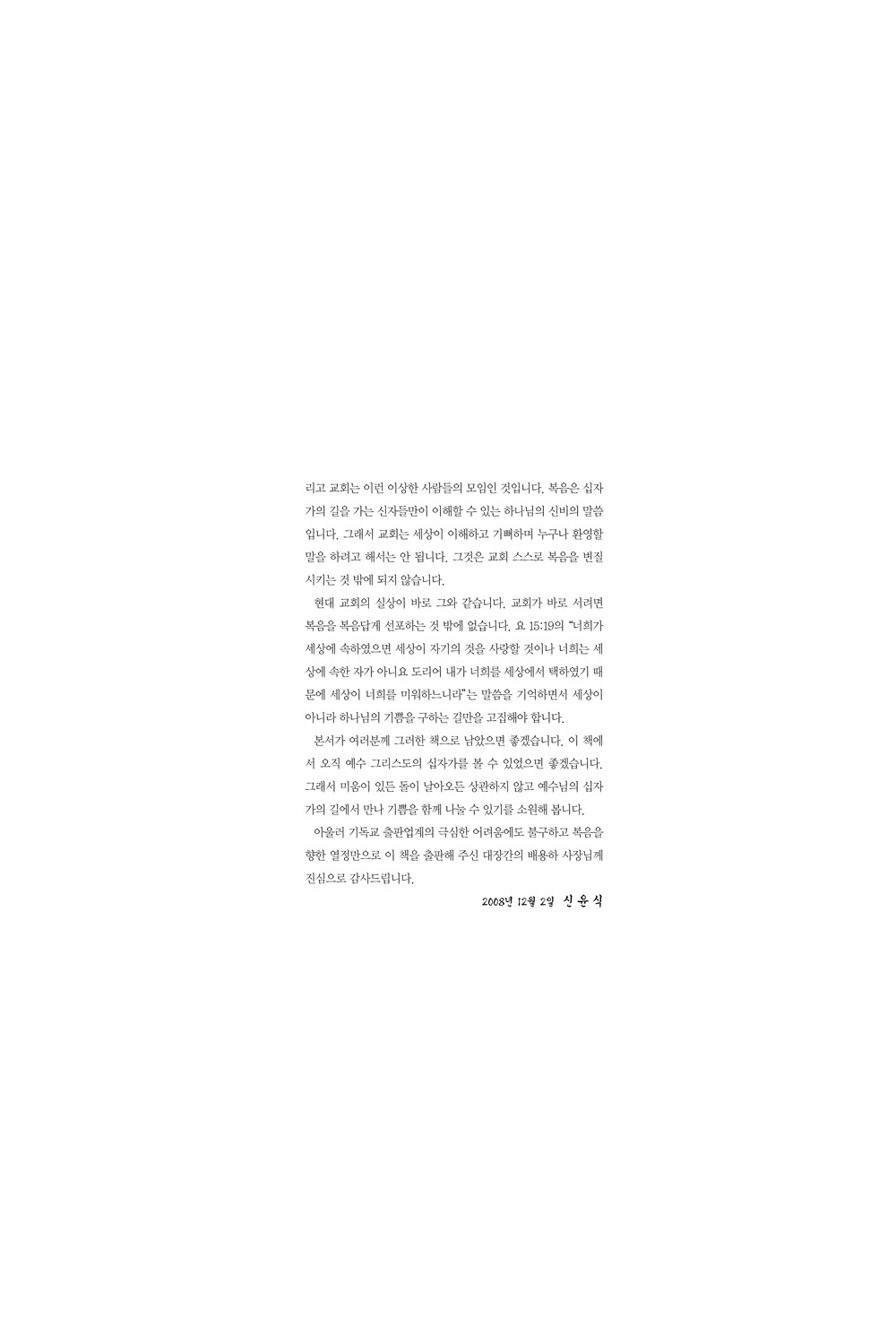 교회가 바로 서려면 복음을 복음답게 선포하는 것 밖에 없습니다. 요 15:19 의 "너희가 세상에 속하였으면 세상이 자기의 것을 사랑할 것이나 너희는 세상에 속한 자가 아니요 도리어 내가 너희를 세상에서 택하였기 때문에 세상이 너희를 미워하느니라"는 말씀을 기억하면서 세상이 아니라 하나님의 기쁨을 구하는 길만을 고집해야 합니다.
